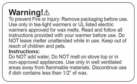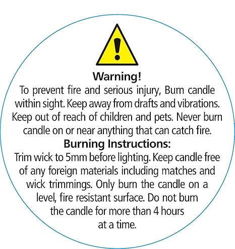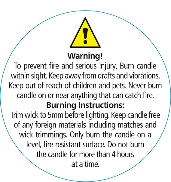 Warning Labels for Candles | Natures Garden Candle Supplies Warning Labels for Candles- 100 Count. Warning label size: 1.25 inch diameter. Warning Label Reads: Caution: Failure to follow instructions could result in fire hazard, injury, or smoke damage. Keep wax free of matches, wick trimmings, or other flammable materials. Keep wick centered & trimmed to 1/4 in. to prevent smoking & soot build up on ...